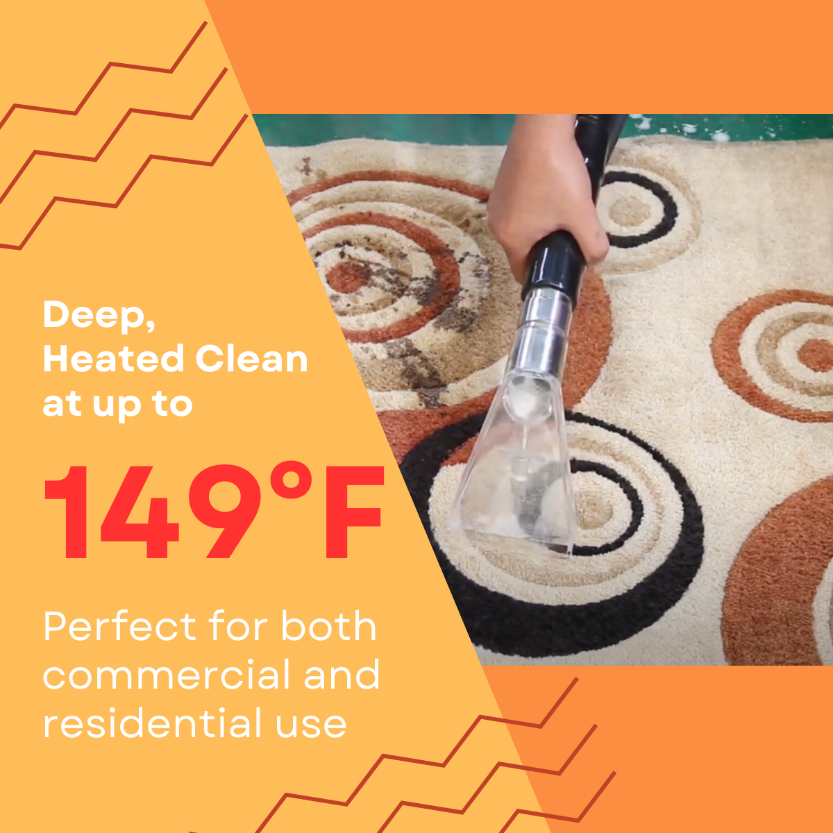 This dual tank carpet and upholstery portable extractor delivers powerful, deep cleaning with a 1000W vacuum motor, 160 PSI pump, and water heated to 149°F. Lightweight and flexible, it's perfect for commercial professional use.
