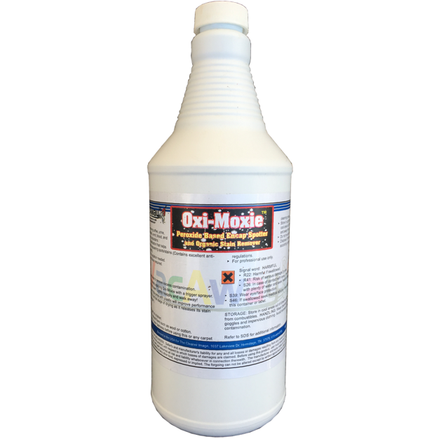 Oxi-Moxie is a super aggressive, crystallizing, encapsulating spot/stain remover that effectively removes most organic spots/stains. After cleaning the stained area to remove excess contamination, it should be applied using a trigger sprayer. Its stain removal qualities is provided by the hydrogen peroxide it contains. It not only removes stubborn spots and stains, but it also prevents them from coming back with its excellent anti-resoiling agents. It is a perfect combination of low pH, aggressive surfactant technology, encapsulating polymers and stain removing hydrogen peroxide.