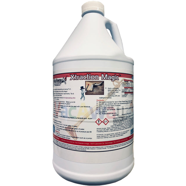 Formulated for Hot Water Extraction systems to clean commercial carpet with outstanding results! Xtraction Magic is a super aggressive, film forming, encapsulating pre-spray that slices through grease and soil like magic. It’s encapsulating qualities insures that you will never have to worry about leaving a dirt attracting residue that causes rapid re-soiling. It is also excellent at removing soapy or sticky residue left behind from previously applied products, sticky soda spills, etc. It is great for Greasy Spoon Restaurants, Trashed Apartments, or any place where nothing else will get the job done!