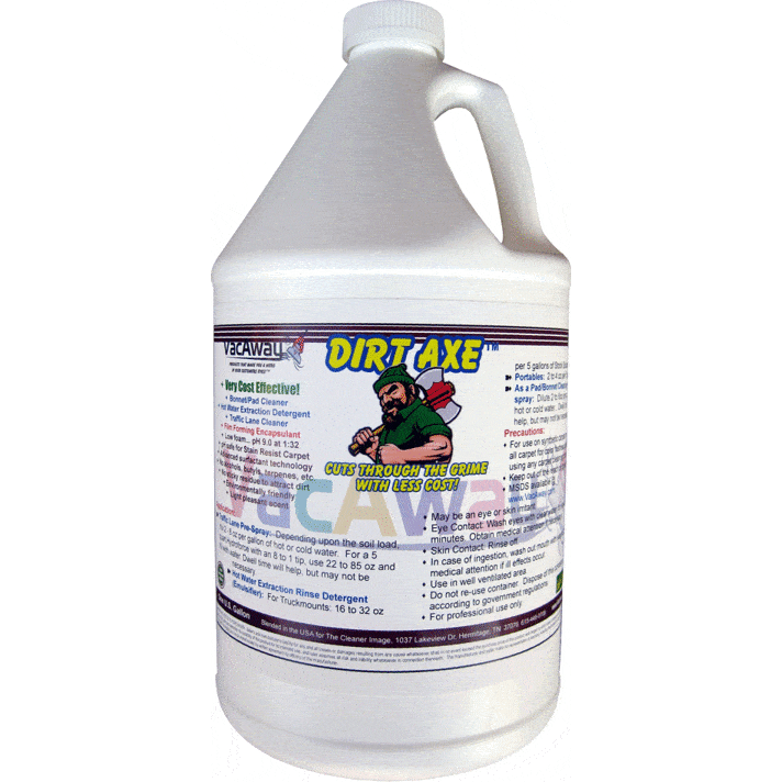 Dirt Axe has exceptional grease cutting power and cleansing action. It penetrates, breaks up and emulsifies the oily film that binds dirt particles to carpet fibers. Its grease & oil cutting power is accomplished without petroleum distillates, butyl, enzymes or phosphates. Dirt Axe is more than 99.8% readily biodegradable at use dilution.